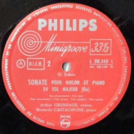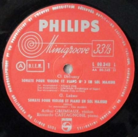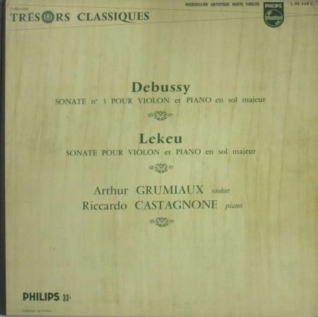 アーティスト:アルトゥール・グリュミオー (Vn) 〜 リッカルド・カスタニョーネ (Pf) Arthur Grumiaux 〜 Riccardo Castagnone   タイトル:ドビュッシー ヴァイオリン・ソナタ ト長調 / ルクレール ヴァイオリン・ソナタ ト長調   国籍:仏   レーベル:PHILIPS   レコード番号:L 00.348 L   盤質:B (ノイズ極少)   備考:12インチ / モノラル / 厚い三方見開きジャケット