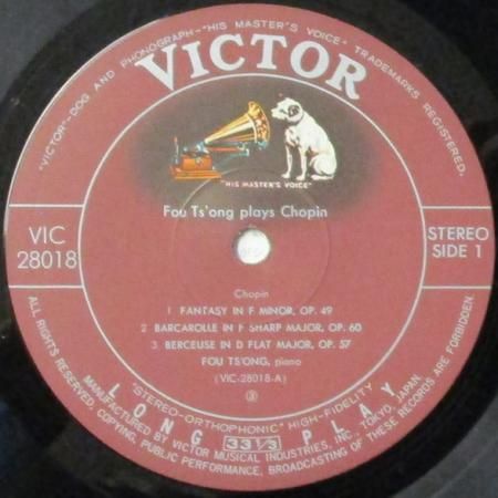 アーティスト:フー・ツォン (Pf) Fou Ts'ong   タイトル:ロマンティック・ショパン・リサイタル 〜 幻想曲 ヘ短調 / 舟歌 嬰ヘ長調 / 子守歌 変ニ長調 / 幻想ポロネーズ 変イ長調 / 葬送行進曲 ハ短調 / 3つの新練習曲 第1番 ヘ短調 / 第2番 変イ長調 / 第3番 変ニ長調   国籍:日   レーベル:VICTOR   レコード番号:VIC 28018   盤質:B (ノイズ極少)   備考:12インチ / ステレオ