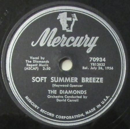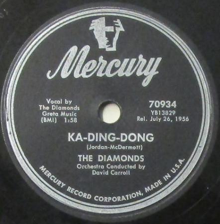 アーティスト:ザ・ダイアモンズ The Diamonds タイトル:KA-DING-DONG / SOFT SUMMER BREEZE 国籍:米 レーベル:MERCURY レコード番号:70934 盤質:AB (サーフェイスノイズ少) 備考:10インチ / Doo Wop / 音Good♪