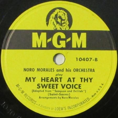 アーティスト:ノロ・モラレス & ヒズ Orc. Noro Morales and His Orchestra タイトル:THE PEANUT VENDOR / MY HEART AT THY SWEET VOICE 国籍:米 レーベル:MGM レコード番号:10407 盤質:B (サーフェイスノイズ少) 備考:10インチ / 音Good♪
