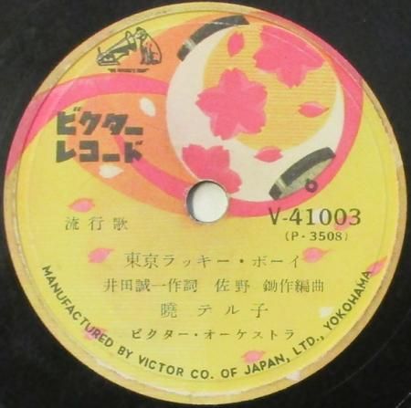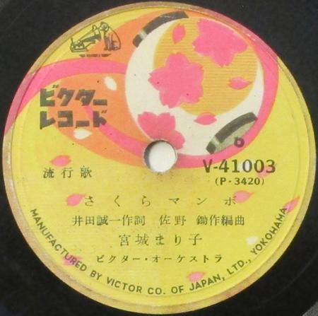 アーティスト:宮城まり子 / 曉テル子 タイトル:さくらマンボ / 東京ラッキー・ボーイ 国籍:日 レーベル:VICTOR (N盤) レコード番号:V 41003 盤質:B (サーフェイスノイズ少) 備考:10インチ / 音Good♪