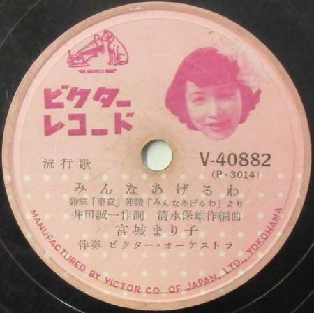 アーティスト:宮城まり子 〜 ビクター Orc. タイトル:わかって頂戴この気持 / みんなあげるわ 国籍:日 レーベル:VICTOR (N盤) レコード番号:V 40882 盤質:B (サーフェイスノイズ少) 備考:10インチ / 音Good♪