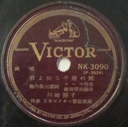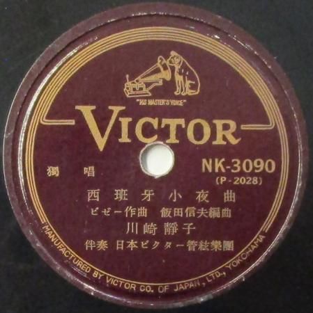 アーティスト:川崎靜子 (Sop) 〜 日本ビクター Orc. タイトル:ビゼー 西班牙小夜曲 / トマ 君よ知るや南の国 国籍:日 レーベル:VICTOR (N盤) レコード番号:NK-3090 盤質:B (サーフェイスノイズ多少++) 備考:10インチ / 音Good♪