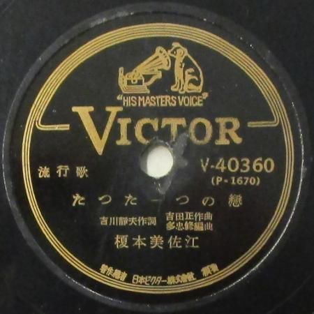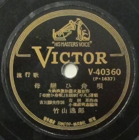 アーティスト:竹山逸郎 / 榎本美佐江 タイトル:母戀ひ舟唄 / たったひとつの戀 国籍:日 レーベル:VICTOR (N盤) レコード番号:V-40360 盤質:BC (浅スリ / サーフェイスノイズ多少++) 備考:10インチ / 音Good♪