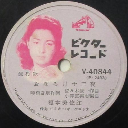 アーティスト:榎本美佐江 / 市丸   タイトル:おぼろ月十三夜 / 潮来情話   国籍:日   レーベル:VICTOR   レコード番号:V 40844   盤質:B (サーフェイスノイズ多少++)   備考:10インチ / 音Good♪