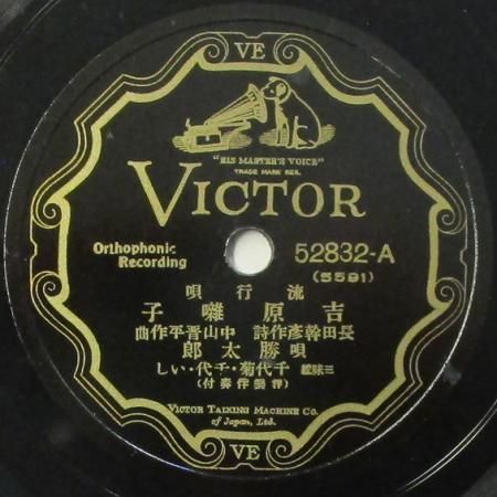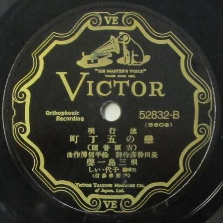 アーティスト:三島 一聲 / 勝太郎   タイトル:戀の五丁町 / 吉原囃子   国籍:日   レーベル:VICTOR (本盤)   レコード番号:52832   盤質:B (サーフェイスノイズ多少+)   備考:10インチ / 音Good♪
