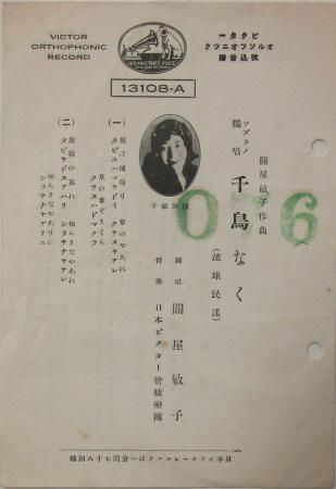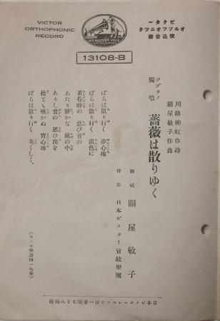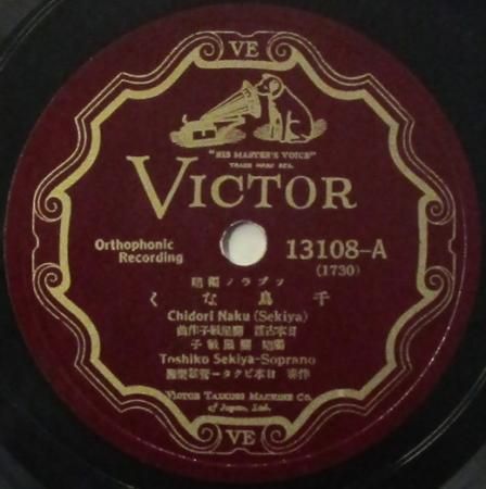 アーティスト:関屋敏子 〜 日本ビクター Orc. タイトル:千鳥なく / 薔薇は散りゆく 国籍:日 レーベル:VICTOR (本盤) レコード番号:13108 盤質:B (サーフェイスノイズ多少++) 備考:10インチ / 歌詞カード付 / 音Good♪