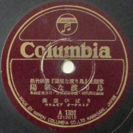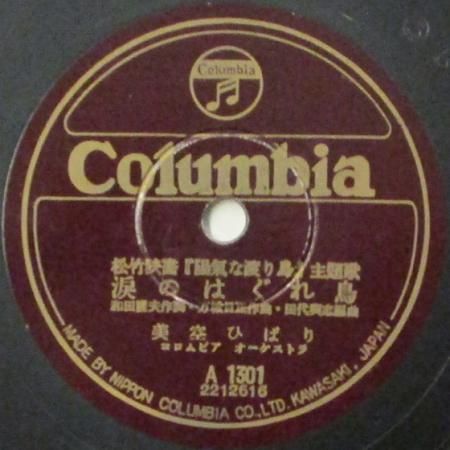 アーティスト:美空 ひばり タイトル:陽氣な渡り鳥 / 涙のはぐれ鳥 国籍:日 レーベル:COLUMBIA レコード番号:A 1301 盤質:B (サーフェイスノイズ少) 備考:10インチ / 音Good♪