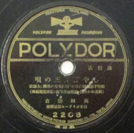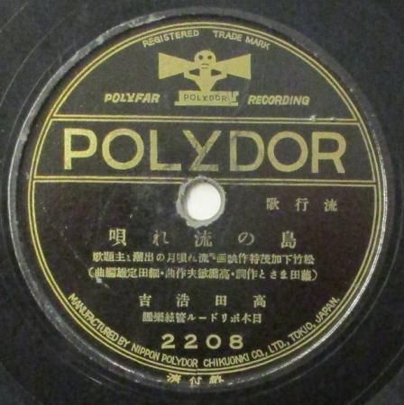 アーティスト:高田 浩吉 タイトル:しゃぼん玉の唄 / 島の流れ唄 国籍:日 レーベル:POLYDOR レコード番号:2208 盤質:BC (浅スリ / サーフェイスノイズ多少++) 備考:10インチ / 音Good♪