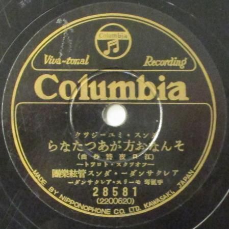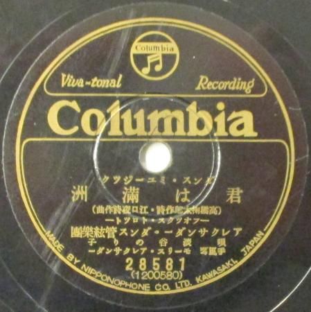 アーティスト:淡谷のり子 〜 アレクサンダー・ダンス Orc. タイトル:君は滿洲 / そんなお方があったなら (インスト) 国籍:日 レーベル:COLUMBIA (本盤) レコード番号:28581 盤質:BC (浅スリ / サーフェイスノイズ多少++) 備考:10インチ / 音Good♪