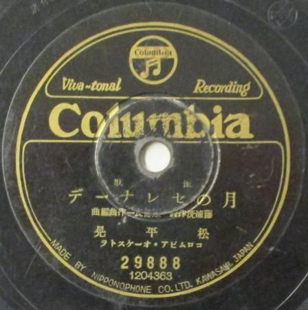 アーティスト:松平晃 / 淡谷 のり子 タイトル:月のセレナーデ / 日暮れの窓で 国籍:日 レーベル:COLUMBIA (本盤) レコード番号:29888 盤質:C (浅スリ / サーフェイスノイズ多少+) 備考:10インチ / 音Good♪