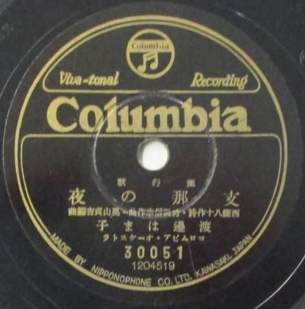 アーティスト:渡邊はま子 / 松平晃   タイトル:支那の夜 / 上海航路   国籍:日   レーベル:COLUMBIA (特盤)   レコード番号:30051   盤質:BC (浅スリ・キズ / サーフェイスノイズ多少++)   備考:10インチ / 音Good♪