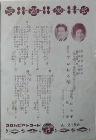 アーティスト:神楽坂はん子・中島孝 / 神楽坂はん子 タイトル:プロレス拳 / お月様には悪いけど 国籍:日 レーベル:COLUMBIA レコード番号:A 2158 盤質:B (サーフェイスノイズ多少++) 備考:10インチ / 音Good♪