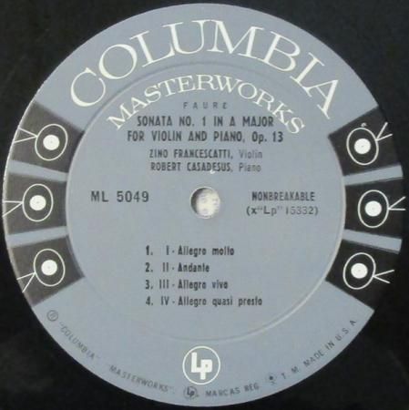 アーティスト:ジノ・フランチェスカッティ (Vn) 〜 ロベール・カサドシュ (指揮) Zino Francescatti 〜 Robert Casadesus タイトル:フォーレ ヴァイオリン・ソナタ 第1番 イ長調 / 第2番 ホ短調 国籍:米 レーベル:COLUMBIA (6E) レコード番号:ML 5049 盤質:B (ノイズ極少) 備考:12インチ / モノラル