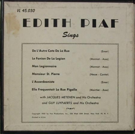 タイトル:EDITH PIAF sings 〜 通りの向こうに / 軍団の旗 / 私の兵隊さん / サン・ピエール氏 / アコーディオン弾き / ピガール通いの女