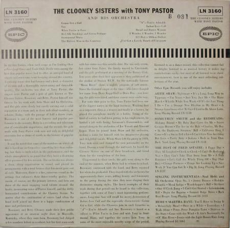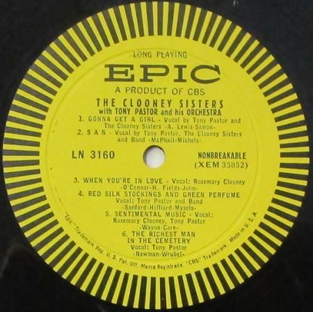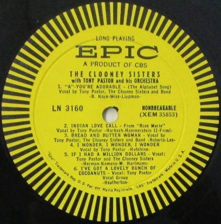 タイトル:THE CLOONY SISTERS WITH TONY PASUTER AND HIS ORCHESTRA 〜 (Side-1) Gonna Get a Girl / San / When You're in Love / Red Silk Stocking and Green Perfume / Sentimental Music / The Richest Man in the Cemetery / (Side-2) "A" __ you're Adorable / Indian Love Call / Bread and Butter Woman / I Wonder, I Wonder, I Wonder / If I Had a Million Dollars / I've Got a Lovely Bunch of Cocoanuts