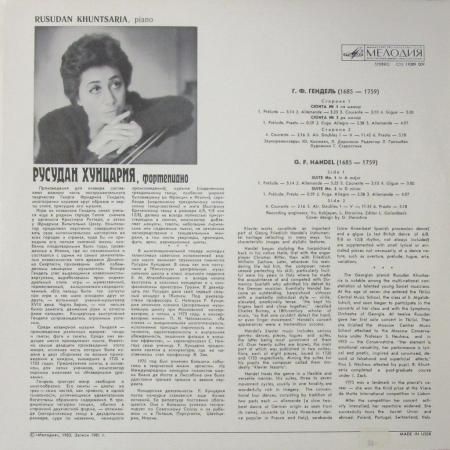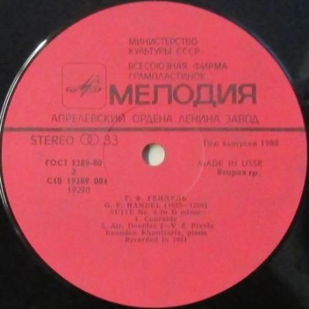 アーティスト:ルスダン・クンツァリア (Pf) Rusudan Khuntsaria タイトル:ヘンデル 組曲 第1番 イ長調 / 第3番 ニ短調 国籍:露 レーベル:MELODIYA (赤・ゴシック) レコード番号:C10 19289 004 (GOST 5289-80) 盤質:B (ノイズ極少) 備考:12インチ / ステレオ