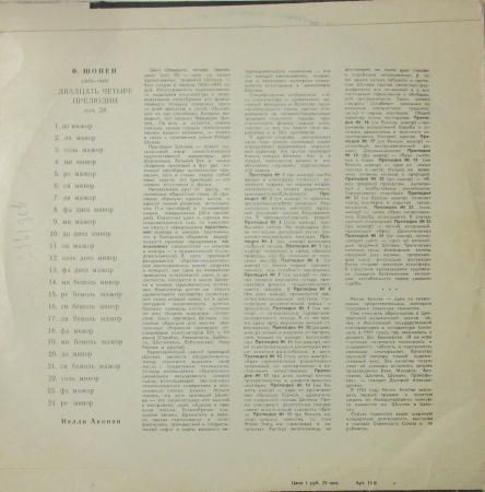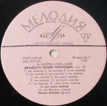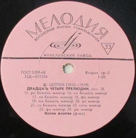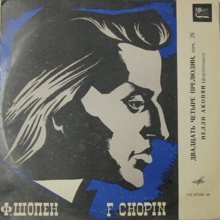 アーティスト:ネリー・アコピアン (Pf) Nelly Akopian タイトル:ショパン 24の前奏曲 国籍:露 レーベル:MELODIYA (ピンク・ダブルレター) レコード番号:33D 027245 - 6 (GOST 5289-68) 盤質:B (ノイズ極少) 備考:12インチ / モノラル