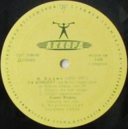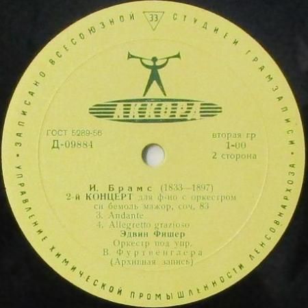 アーティスト:エドウィン・フィッシャー (Pf) / ウィルヘルム・フルトヴェングラー (指揮) 〜 ベルリン・フィル Edwin Fischer / Wilhelm Furtwangler   タイトル:ブラームス ピアノ協奏曲 第2番 変ロ長調   国籍:露   レーベル:MELODIYA (黄 / AKKOPA)   レコード番号:D 09883 - 09884 (GOST 5289-56)   盤質:BC (浅スリ / ノイズ極少)   備考:12インチ / モノラル /上開き穴あきジャケット / ライヴ!