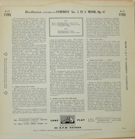 アーティスト:ウィルヘルム・フルトヴェングラー (指揮) 〜 ウィーン・フィル Wilhelm Furtwangler 〜 ViennaPhilharmonic Orchestra   タイトル:ベートーヴェン 交響曲 第5番 ハ短調 「運命」   国籍:英   レーベル:HMV (ニッパー / ミゾあり)   レコード番号:ALP 1195   盤質:BC (浅スリ / ノイズ極少)   備考:12インチ / モノラル