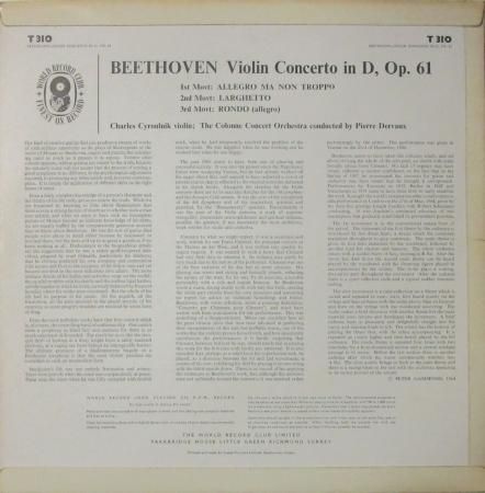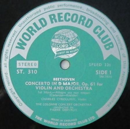アーティスト:シャルル・シルルニク (Vn) / ピエール・デルボー (指揮) 〜 コンセール・コロンヌ Orc. Charles Cyroulnik with The Colonne Concert Orchestra conducted by Pierre Dervaux タイトル:ベートーヴェン ヴァイオリン協奏曲 ニ長調 国籍:英 レーベル:WORLD RECORD RDCLUB レコード番号:ST. 310 盤質:B (ノイズ極少) 備考:12インチ / ステレオ / 1964年