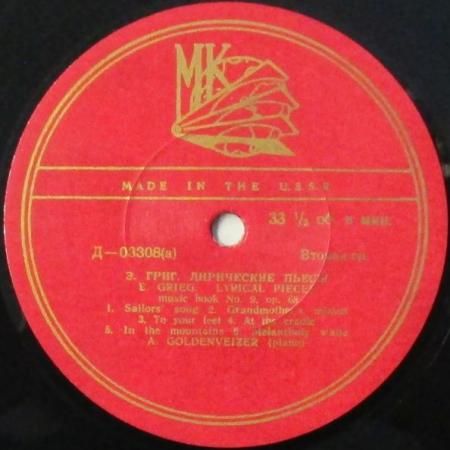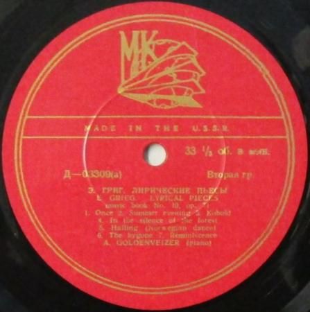 アーティスト:アレクサンドル・ゴリデンヴェイゼル (Pf) タイトル:グリーグ 抒情小品集 〜 第9集 & 第10集 国籍:露 レーベル:MK (赤・金) レコード番号:D 03308 - 9 盤質:B (ノイズ極少) 備考:12インチ / モノラル
