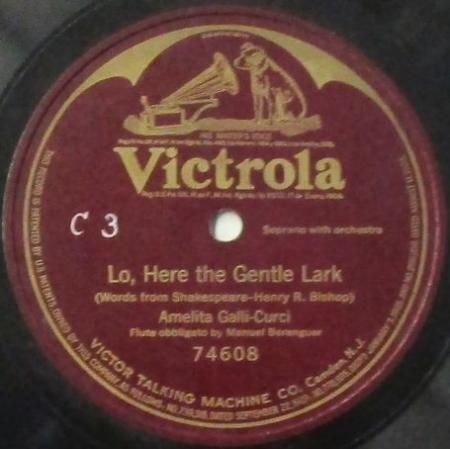 アーティスト:アメリータ・ガリ=クルチ (Sop) 〜 マヌエル・ベレンゲル (Fl) & Orc. Amelita Galli-Curci with Manuel Berenguer 〜 Orchestra   タイトル:ビショップ 聞け、やさしいひばりを   国籍:米   レーベル:VICTROLA   レコード番号:74608   盤質:B (サーフェイスノイズ多少++)   備考:12インチ / 片面盤 / 音Good♪