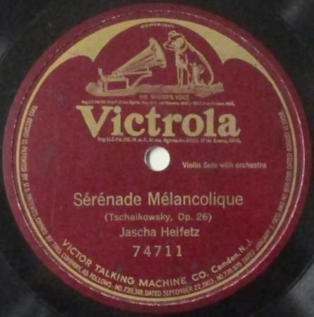 アーティスト:ヤッシャ・ハイフェッツ (Vn) 〜 Orc. Jascha Heifetz with Orchestra   タイトル:チャイコフスキー 憂鬱なセレナード 変ロ短調   国籍:米   レーベル:VICTROLA   レコード番号:74711   盤質:B (サーフェイスノイズ多少++)   備考:12インチ / 片面盤 / 音Good♪