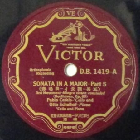 アーティスト:パブロ・カザルス (Vc) 〜 オットー・シュルホフ (Pf) Pablo Casals 〜 Otto Schulhof   タイトル:ベートーヴェン チェロ・ソナタ 第3番 イ長調 / (6面) メヌエット ト長調   国籍:日   レーベル:VICTOR   レコード番号:D.B. 1417 - 9   盤質:B (サーフェイスノイズ少)   備考:3枚組 / 12インチ / 音Good♪