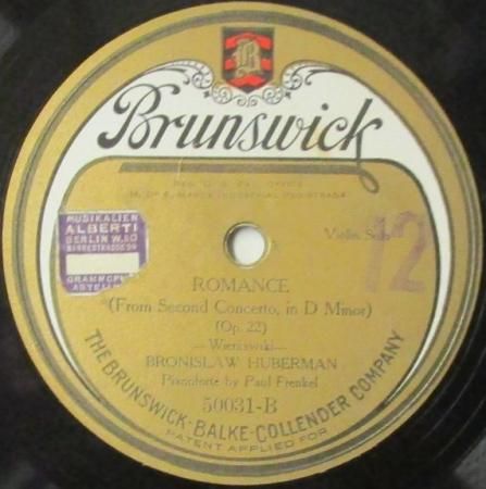 アーティスト:ブロニスラフ・フーベルマン (Vn) 〜 ポール・フレンケル (Pf) Bronislaw Huberman 〜 Paul Frenkel タイトル:ヴィエニャフスキ カプリッチョ・ワルツ / ヴァイオリン協奏曲 第2番 〜 第2楽章 ロマンス 国籍:米 レーベル:BRUNSWICK レコード番号:50031 盤質:B (サーフェイスノイズ多少) 備考:12インチ / 音Good♪