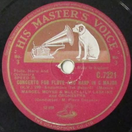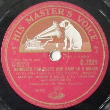 アーティスト:マルセル・モイーズ (Fl) / リリー・ラスキーヌ (Hrp) / ピエロ・コッポラ (指揮) 〜 管弦楽団 Marcel Moyse / Lily Laskine / Piero Coppola 〜 Orchestra タイトル:モーツァルト フルートとハープのための協奏曲 ハ長調 国籍:英 レーベル:HMV (あずき色 / セピアニッパー) レコード番号:D 7219 - 7221 盤質:B (サーフェイスノイズ多少++) 備考:3枚組 / 12インチ / 音Good♪