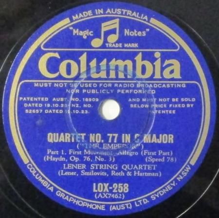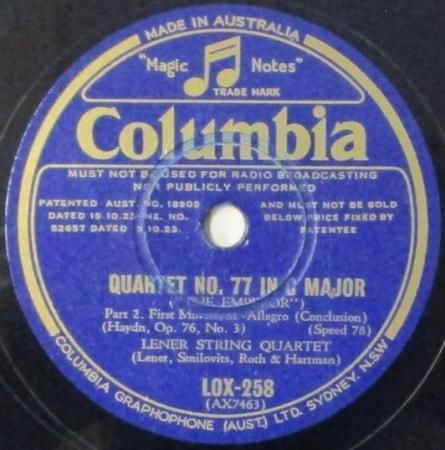 アーティスト:レナー弦楽四重奏団 Lener String Quartet タイトル:ハイドン 弦楽四重奏曲 第77番 ハ長調 「皇帝」 国籍:オーストラリア レーベル:COLUMBIA レコード番号:LOX 258 - 261 盤質:B (サーフェイスノイズ多少++) 備考:4枚組 / 12インチ / 音Good♪