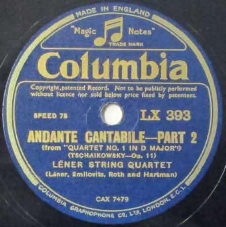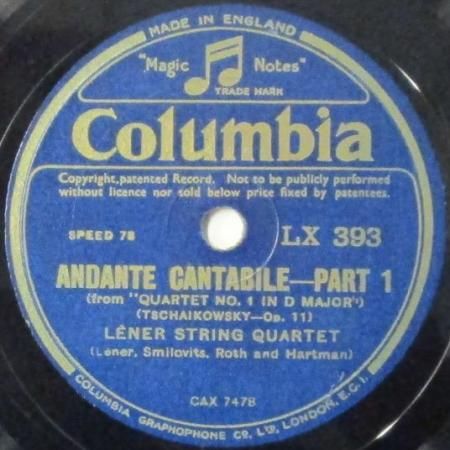 アーティスト:レナー弦楽四重奏団 Lener String Quartet タイトル:チャイコフスキー 弦楽四重奏曲 第1番 ニ長調 〜 アンダンテ・カンタービレ (PART 1 & PART 2) 国籍:英 レーベル:COLUMBIA レコード番号:LX 393 盤質:B (サーフェイスノイズ多少++) 備考:12インチ / 音Good♪