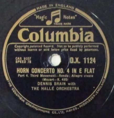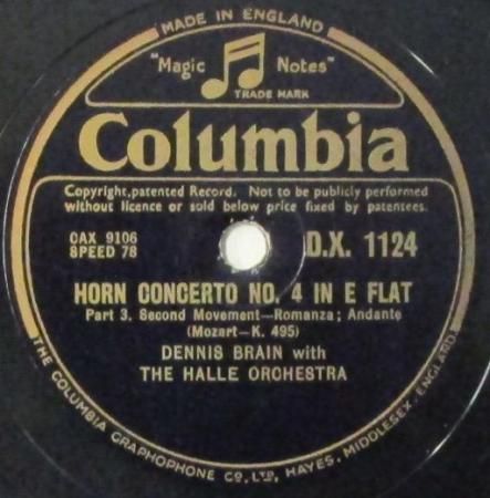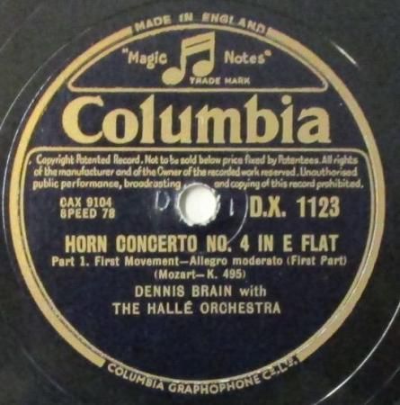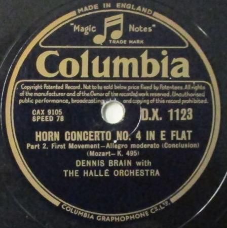 アーティスト:デニス・ブレイン (Hrn) 〜 ハレ管弦楽団 Dennis Brain 〜 The HALLE Orchestra   タイトル:モーツァルト ホルン協奏曲 第4番 変ホ長調   国籍:英   レーベル:COLUMBIA   レコード番号:DX.1123 - 1124   盤質:B (サーフェイスノイズ多少++)   備考:2枚組 / 12インチ / 音Good♪