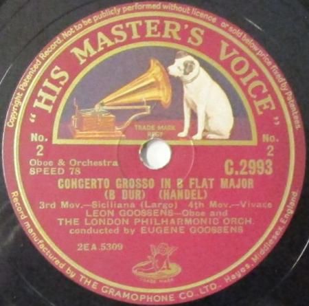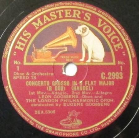 アーティスト:レオン・グーセンス (Ob) / ユージン・グーセンス (指揮) 〜 ロンドン PO. Leon Goossens and The London Philharmonic Orchestra conducted by Eugene Goossens   タイトル:ヘンデル 合奏協奏曲 変ロ長調   国籍:英   レーベル:HMV   レコード番号:C.2993   盤質:B (サーフェイスノイズ多少++)   備考:12インチ / 音Good♪