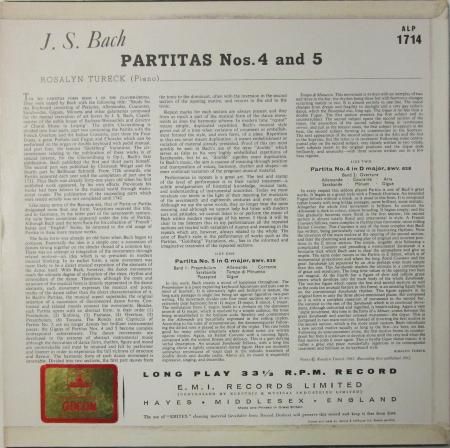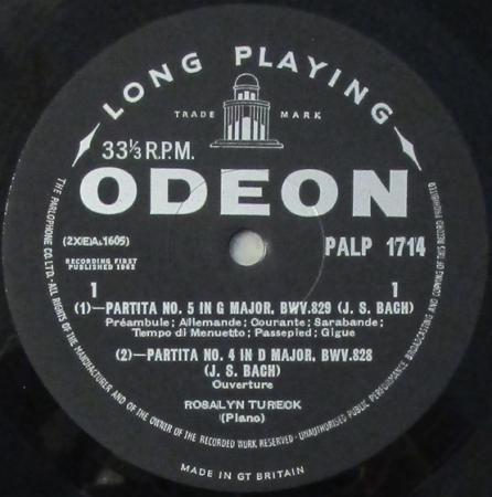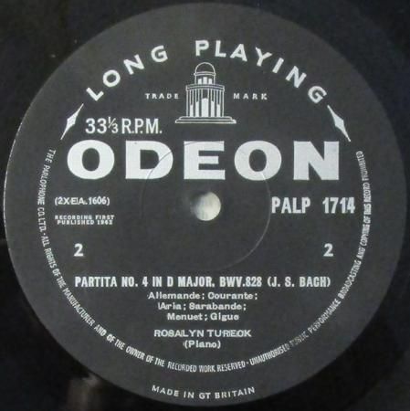 アーティスト:ロザリン・テューレック (Pf) Rosalyn Tureck   タイトル:バッハ パルティータ 第4番 ニ短調 / 第5番 ト長調   国籍:英   レーベル:ODEON   レコード番号:PALP 1714   盤質:B (ノイズ極少)   備考:12インチ / モノラル