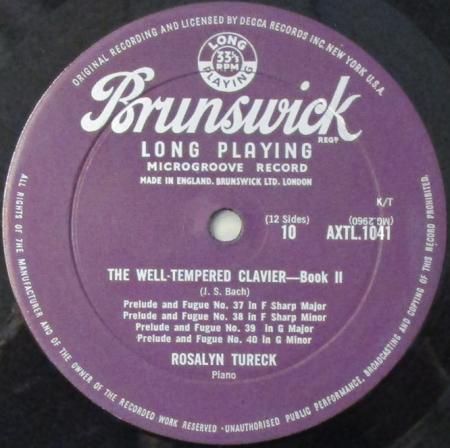 アーティスト:ロザリン・テューレック Rosalyn Tureck   タイトル:バッハ 平均律クラヴィア曲集 第33番 〜 第40番 (第2部 第9番〜第16番)   国籍:英   レーベル:BRUNSWICK (紫 / ミゾあり)    レコード番号:AXZL 1041   盤質:B (ノイズ極少)   備考:12インチ / モノラル / 6枚組の中の1枚です