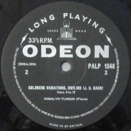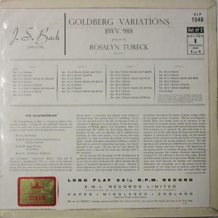 アーティスト:ロザリン・テューレック (Pf) Rosalyn Tureck タイトル:バッハ ゴルトベルク変奏曲 (アリアと30の変奏曲) ト長調 1 〜 15 国籍:英 レーベル:ODEON レコード番号:PALP 1548 盤質:B (ノイズ極少) 備考:12インチ / モノラル / 2枚組の1枚目